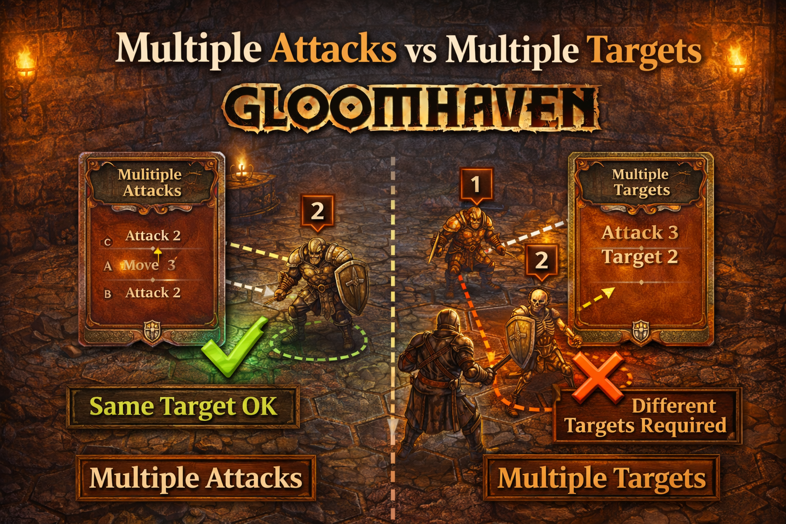 Clear up common mistakes about attacking multiple enemies vs multiple attacks in Gloomhaven — what they mean, how targeting works, and examples you can use at the table.